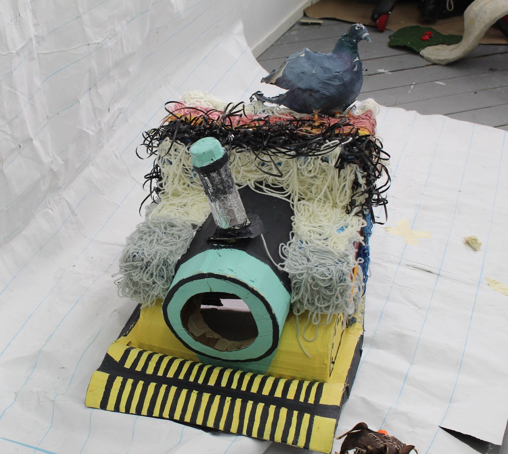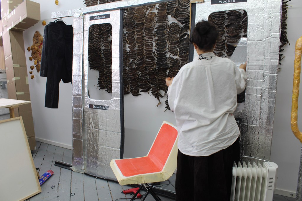 Against the wall, a pair of life-sized subway doors made of cardboard, tape and aluminum foil leans upright, with Welcome aboard, Do not feed Choo Choo and Do not lean on door written across the panels.
