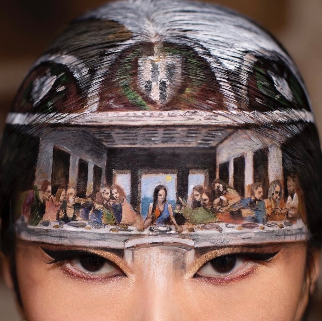 Sometimes the optical illusions portray Dain Yoon blending into the scenery outside her Brooklyn studio. Sometimes, they present Michelangelo’s The Last Supper on her forehead.