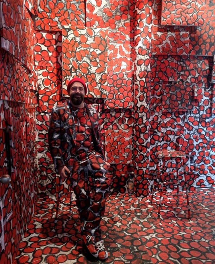 Red blood cells are painted over every inch of wall space, ceiling, floor, furniture and even the artist.